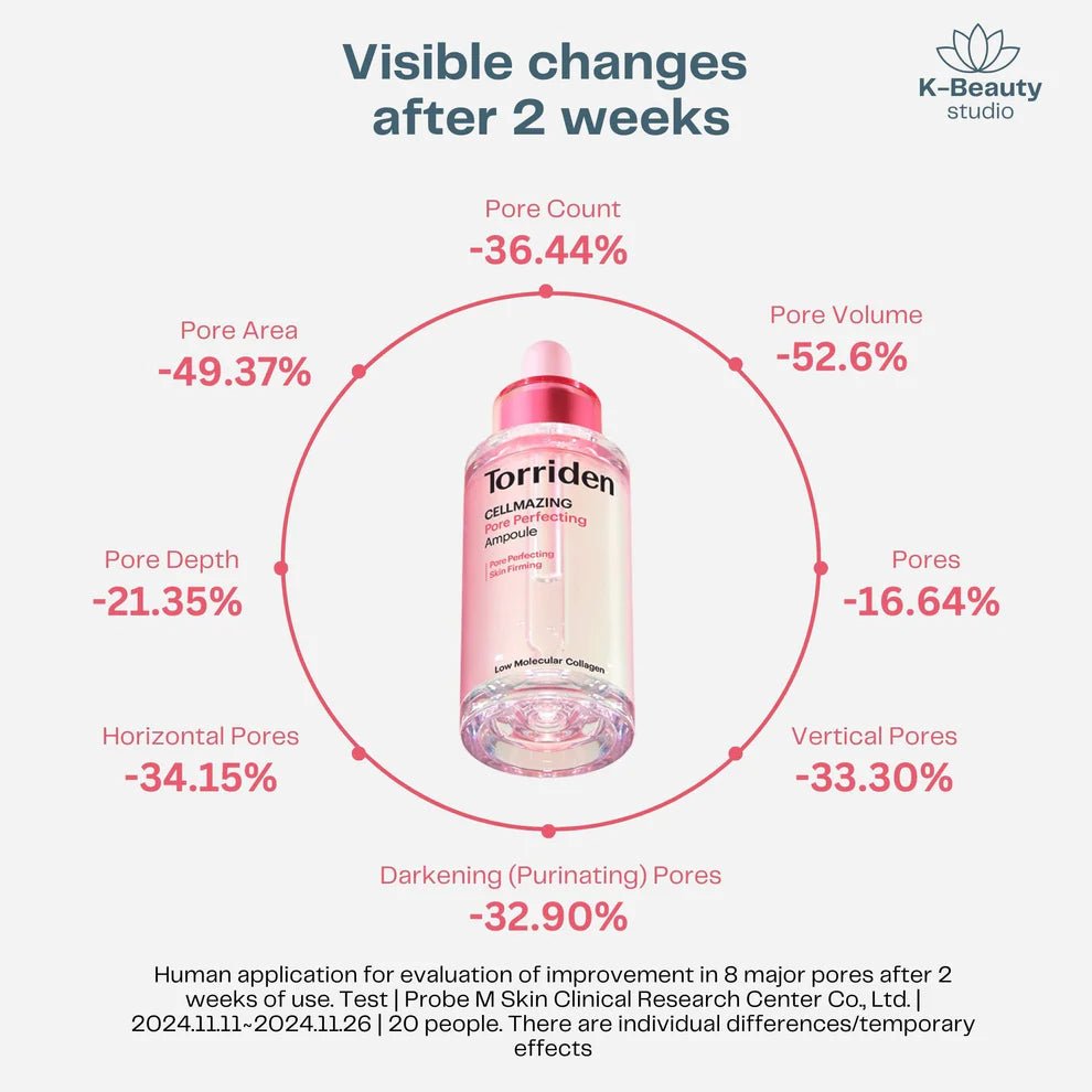 The Torriden Cellmazing Pore Perfecting Ampoule is a lightweight, water-based facial ampoule designed to smooth the look of skin texture and support a refined, conditioned complexion. Developed with low molecular collagen and gentle exfoliating ingredients, it offers a fresh-feeling boost to visibly balance and hydrate the skin.