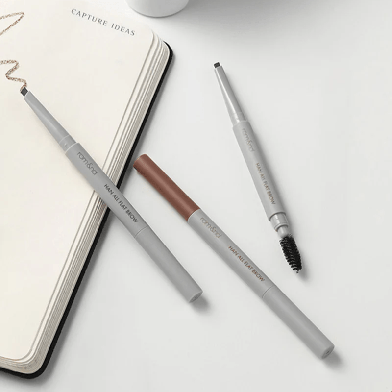 A Korean eyebrow pencil with a slim flat-tip applicator for precise, natural-looking brows. Its dual-ended design features a pencil for defining and filling plus a spoolie brush for seamless blending.