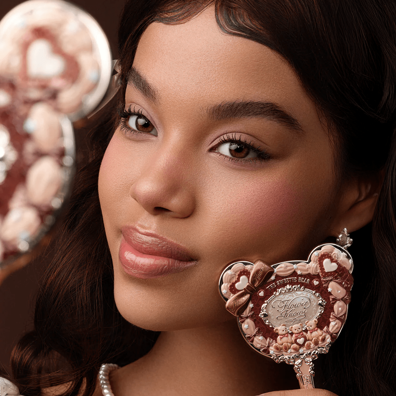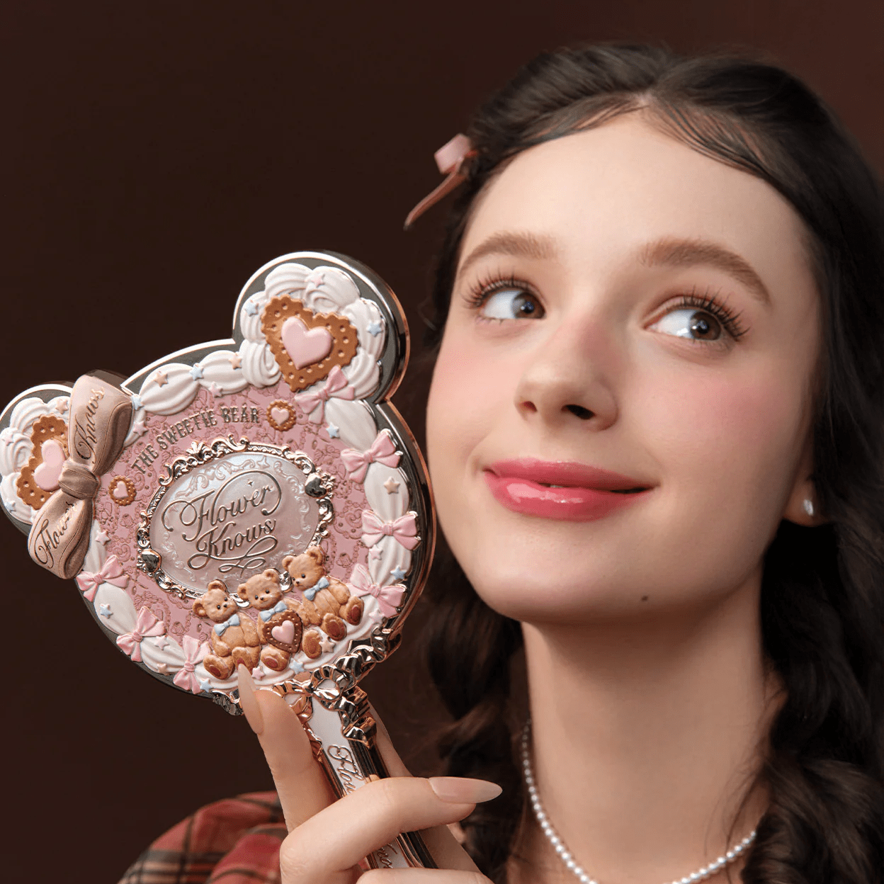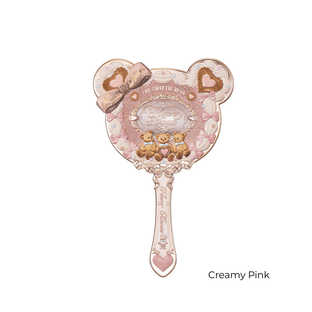 A teddy bear-themed portable mirror with a whimsical dessert-inspired design, offering a wide, oval reflection perfect for on-the-go makeup touch-ups or daily vanity use.