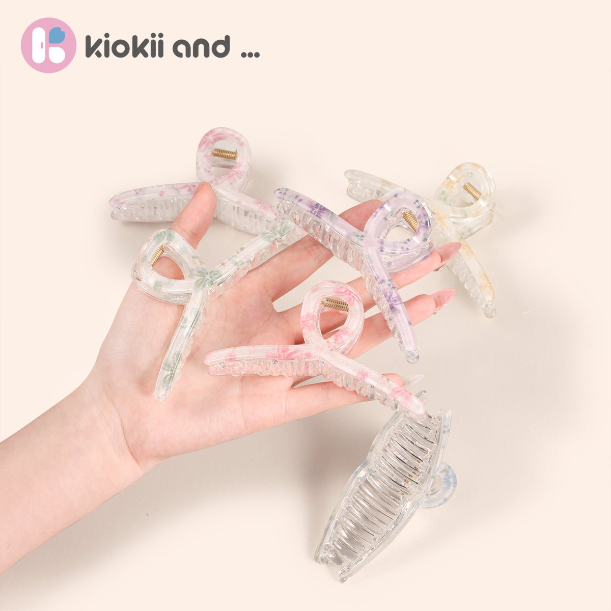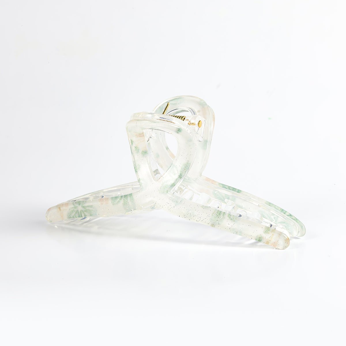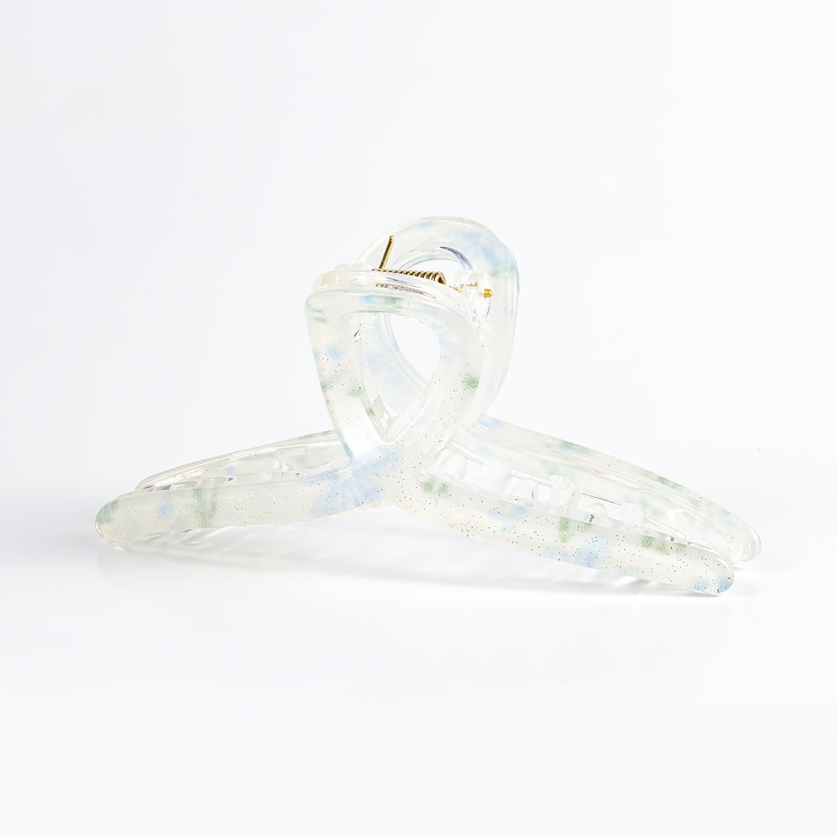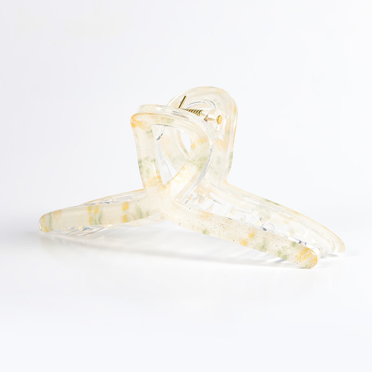 A clear Y-shaped hair claw with embedded floral patterns. Made from lightweight acrylic, this clip offers a comfortable grip for thin to medium hair. Ideal for everyday half-up styles or quick twists.
