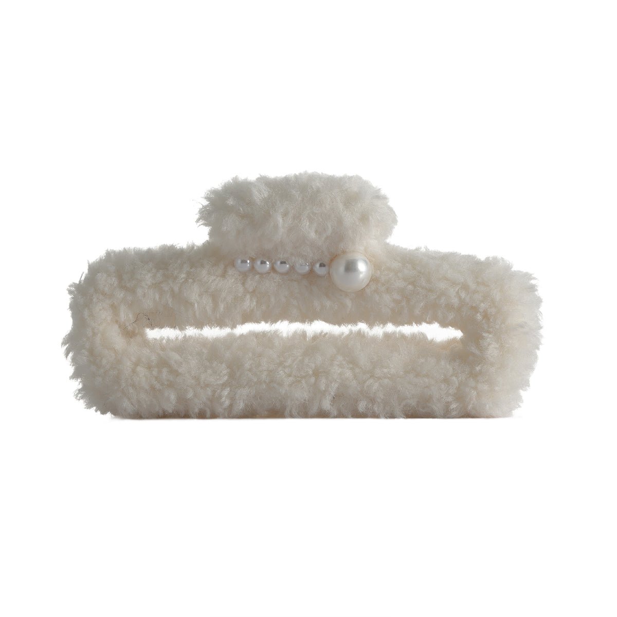 The Fuzzy Rectangle Claw Clip is a stylish, cozy accessory crafted from soft, fluffy plush material, accented with imitation glass pearls for a chic, cute vibe. Equipped with a durable metal spring for easy opening and strong hold, its sturdy PC claw teeth securely grip thick, long, or curly hair without slipping. Perfect for daily styling and elevating winter outfits.