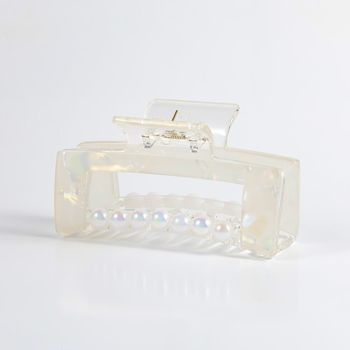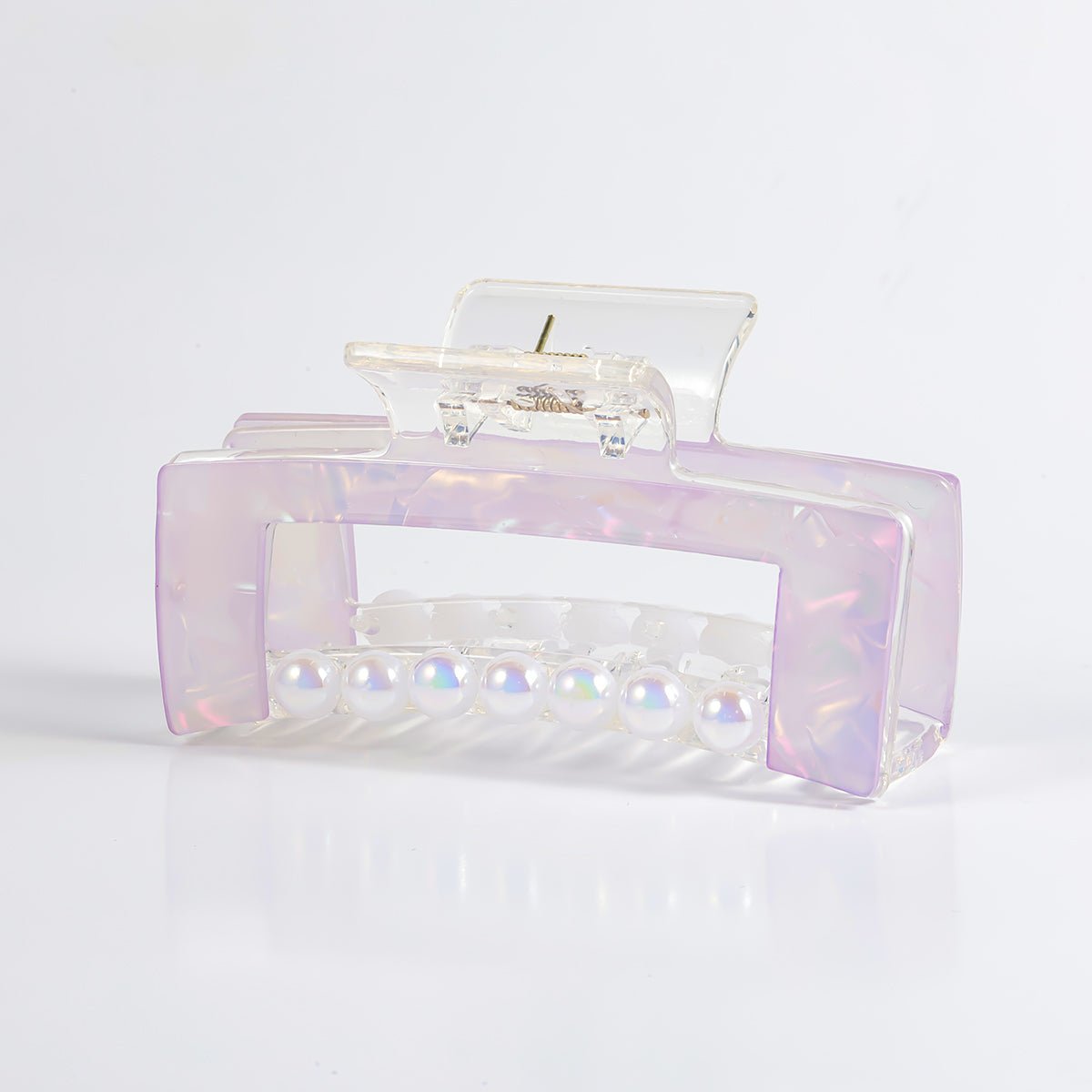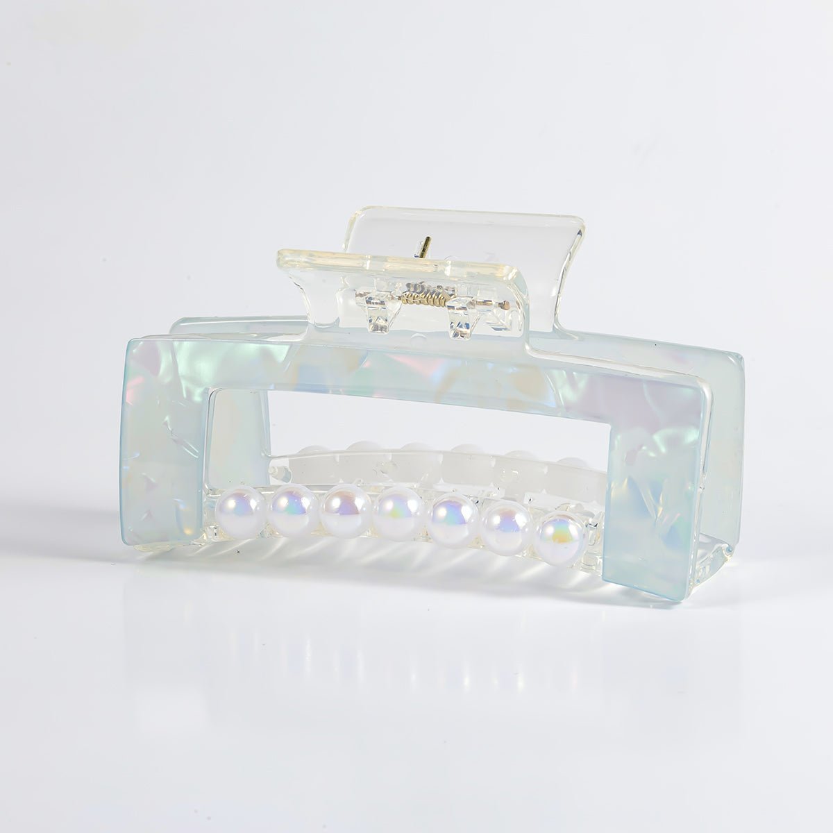 A rectangle hair claw made of iridescent acrylic, finished with a row of pearl accents. Durable and lightweight, designed to hold fine to medium hair securely for daily styling.
