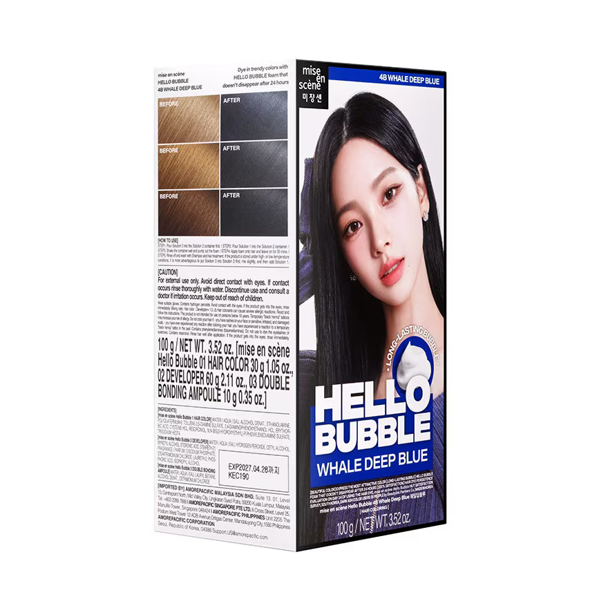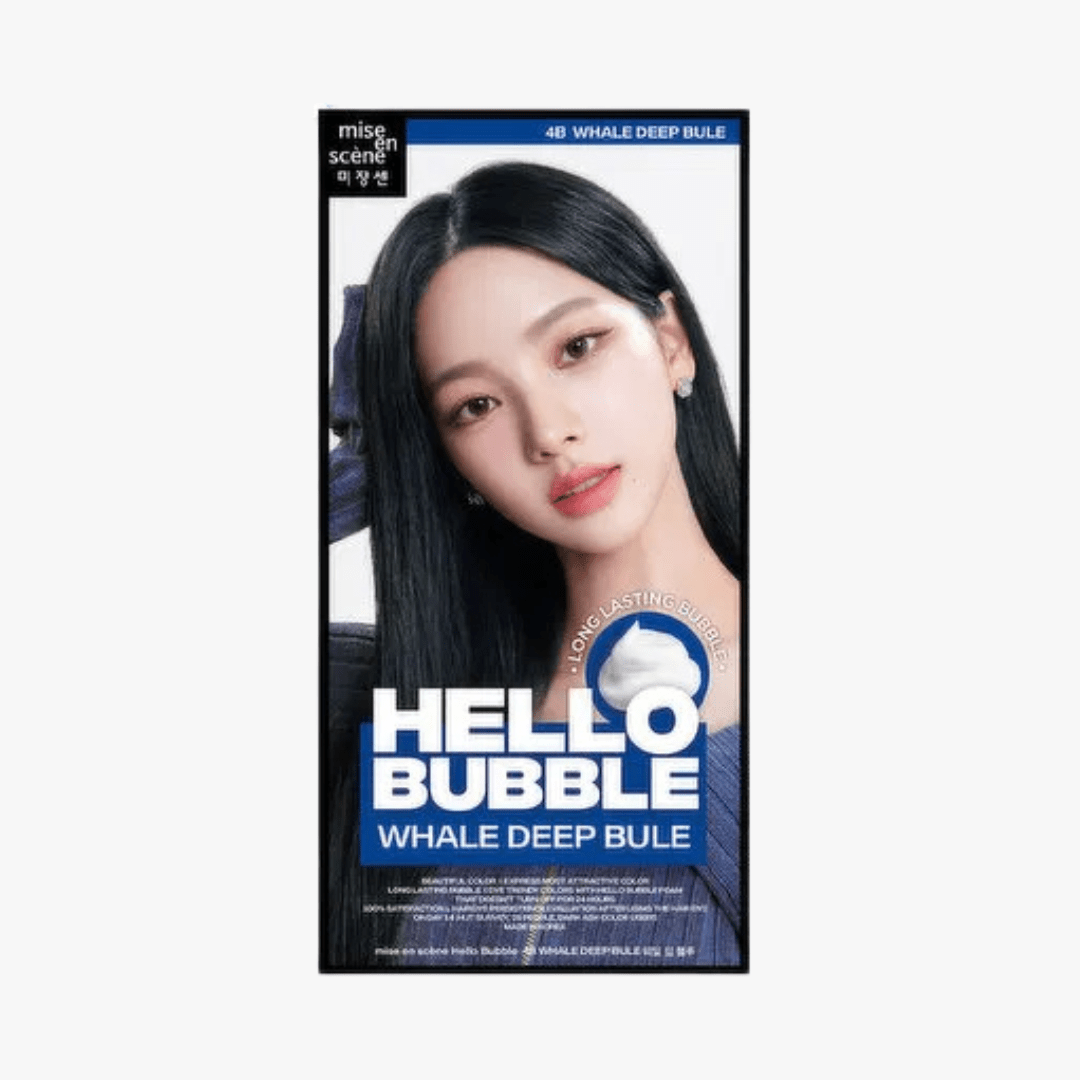 MISE EN SCENE Hello Bubble 4B Whale Deep Blue is an easy-to-use at-home bubble hair dye that creates a deep, vivid blue tone inspired by K-pop styles. Its foam texture allows even, mess-free application, while included conditioning ingredients help keep hair soft and smooth during the coloring process.