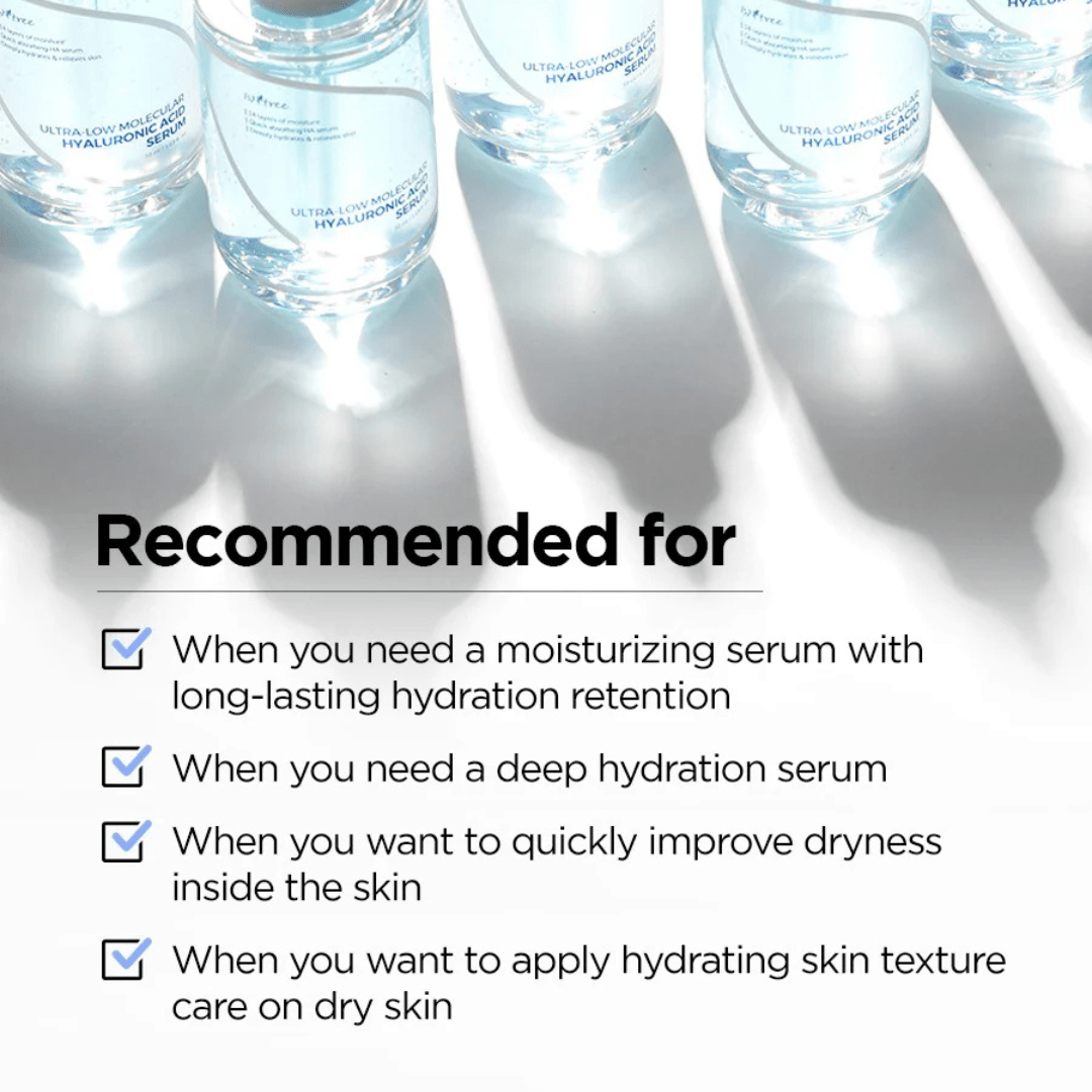 The ISNTREE Ultra-Low Molecular Hyaluronic Acid Serum is a deeply hydrating facial serum that delivers moisture across multiple skin layers using 14 types of hyaluronic acid, including ultra-low molecular forms. Known for its lightweight, non-sticky texture and soothing ingredients like madecassoside and panthenol, this Korean serum is ideal for boosting skin hydration, plumpness, and barrier strength—especially for dry or sensitive skin types.