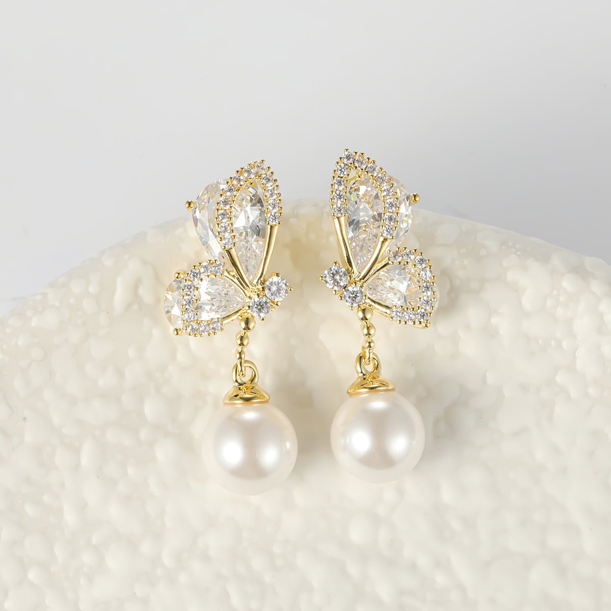 The Arch14 Enchanted Wings & Pearl 18K Gold-Plated Drop Earrings feature lively butterfly wings that perfectly blend romance with elegance. Crafted from high-quality brass and finished with durable 18K gold plating, the exquisite glass pearl and artfully placed zircon accents. Lightweight and hypoallergenic, these earrings are ideal for sensitive ears. The secure 925 sterling silver pin ensures a snug fit all day long, making them perfect for daily wear, work, or casual outings—captivating and romantic.