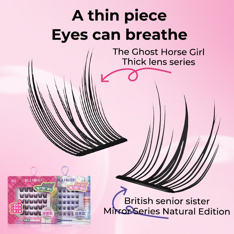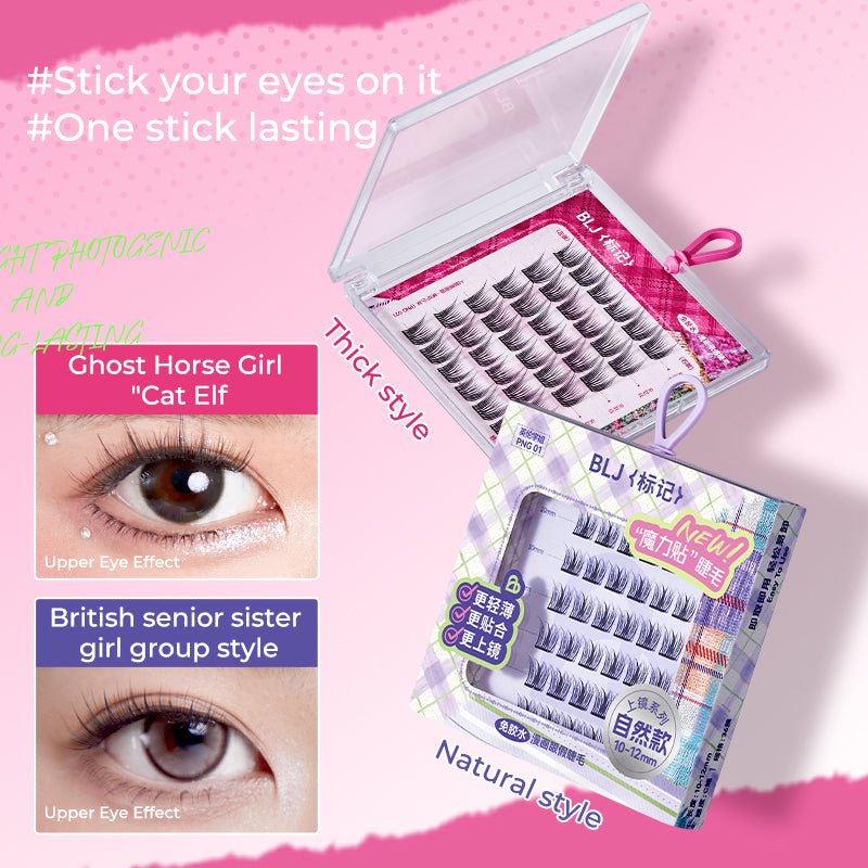 The Guima (Cat Elf) lashes from BLJ are adhesive-free false eyelash clusters designed for a bold and lifted cat-eye effect. Featuring 36 lightweight PBT fiber clusters per box, each lash ranges from 11–13mm in length with a natural C-curl. These magic sticker lashes offer a voluminous, dazzling look without glue, making them quick to apply and comfortable to wear all day.