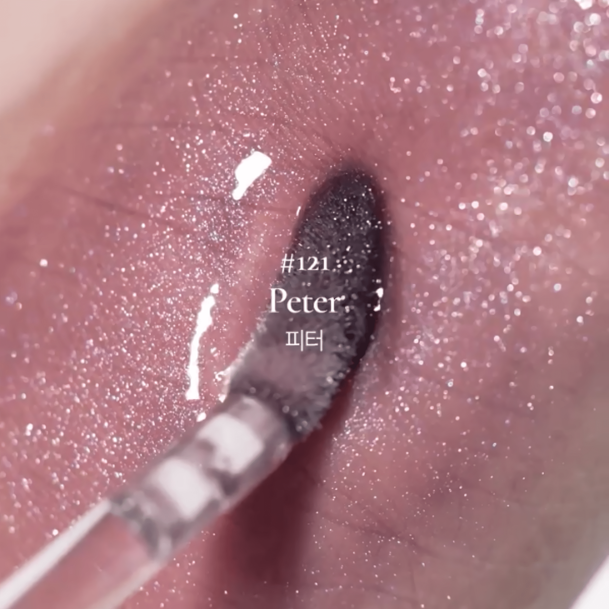 - 121 Peter: A translucent, ashy black shade with white and blue pearl undertones. This edgy, smoky tint gives lips a unique, dreamy depth, perfect for a bold, statement look with a touch of shimmer