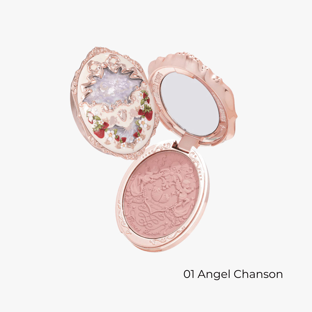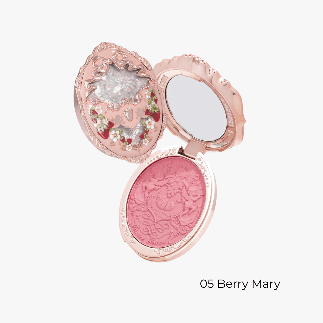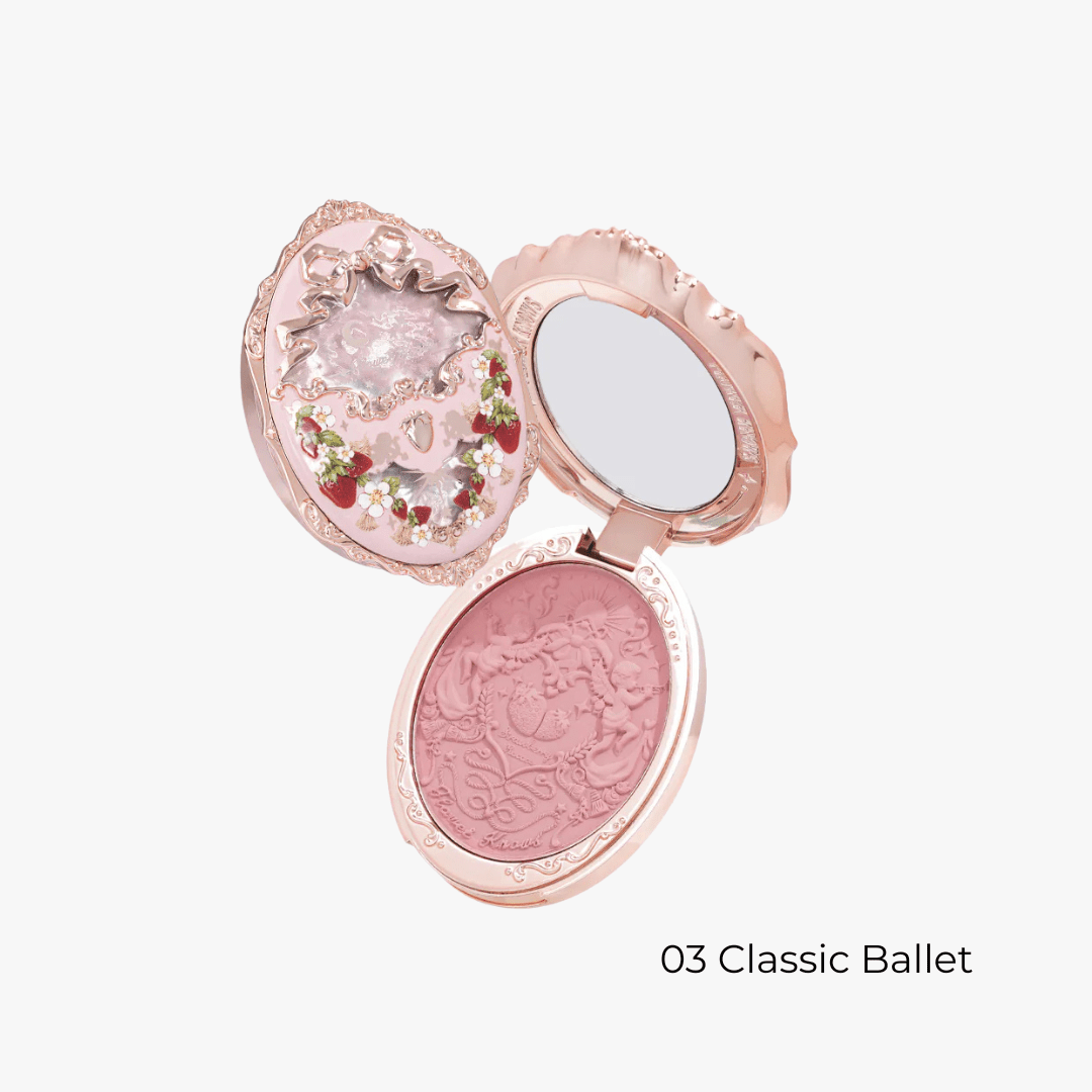 A pressed powder blush featuring finely milled pigment and a soft matte finish. Housed in a vintage-inspired compact with Rococo-style detailing, this embossed blush doubles as a charming collectible and a functional addition to your makeup routine.