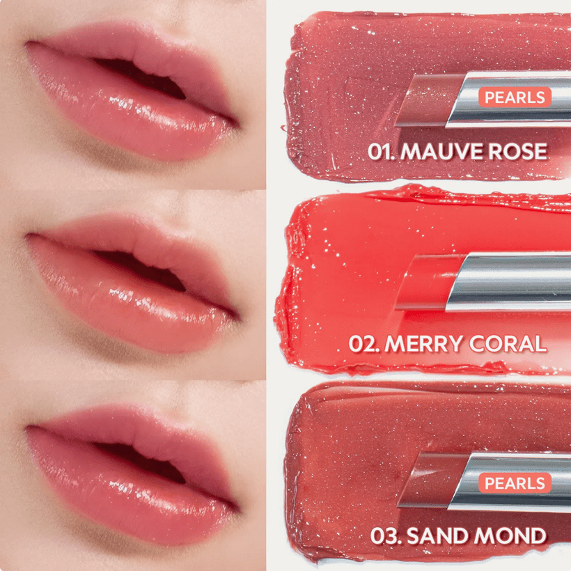 - 03 Sand Mond Pearls: Un nude beige chaud avec une subtile iridescence, idéal pour une finition naturelle « mes lèvres en mieux » avec une touche de lumière.