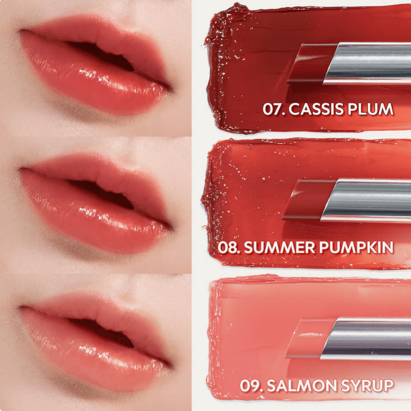 - 09 Salmon Syrup : Un doux rose saumon sirupeux qui fond sur les lèvres pour une touche de couleur et de brillance douce et flatteuse.