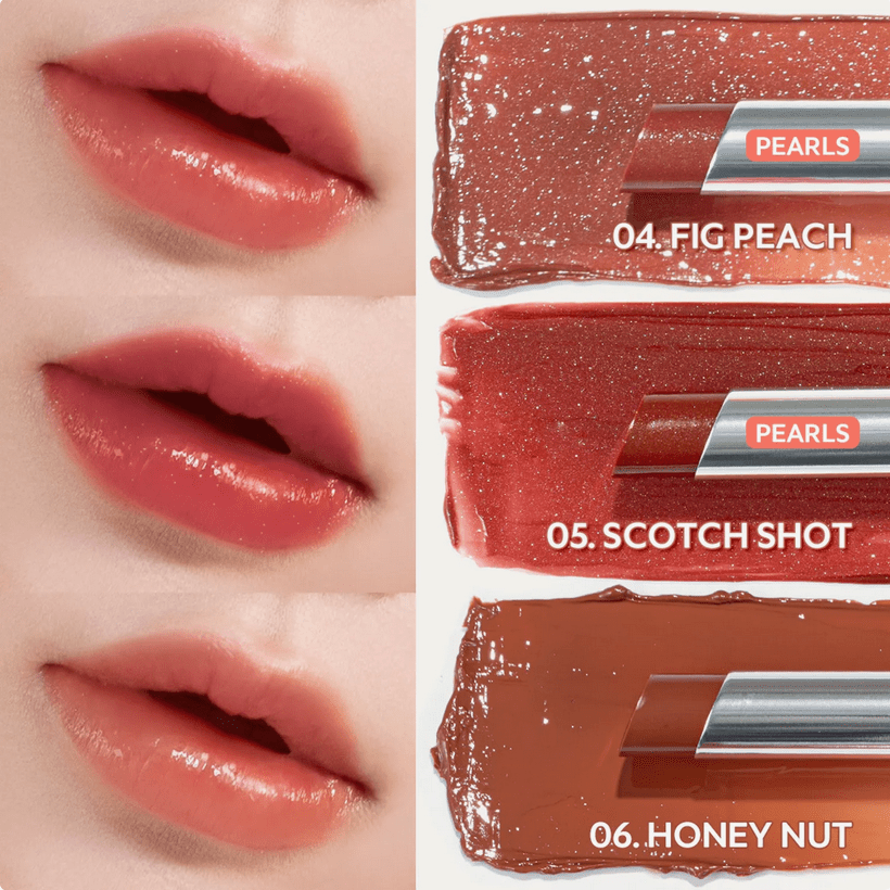 - 04 Fig Peach Pearls: Un pêche ton figue chaud infusé de paillettes, mêlant profondeur fruitée et douceur pour une teinte élégante au quotidien.