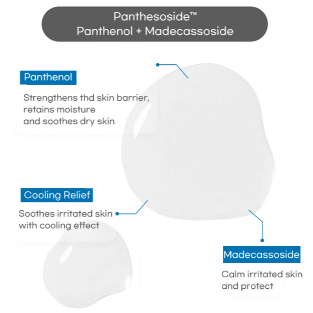 Liste complète des ingrédients : Eau, Propanediol, Glycérine, Bétaïne, Madécassoside, Extrait de feuille de Camellia Sinensis, Extrait de racine de Scutellaria Baicalensis, 1,2-Hexanediol, Butylène Glycol, Éthylhexylglycérine, Carbomère, Polyglycérol-3, Disodium EDTA