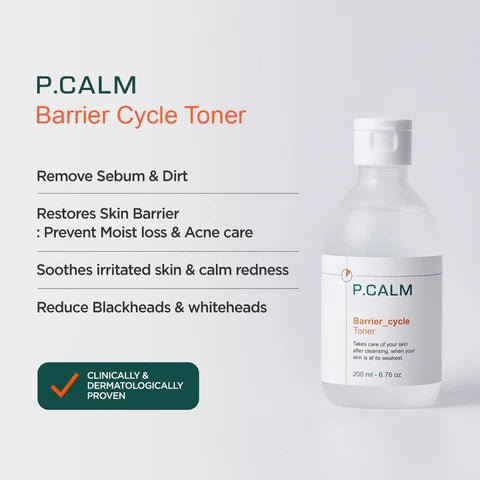 P.CALM Barrier Cycle Toner gently hydrates and soothes sensitive, oily skin. Infused with Azulene, Tea Tree, Centella Asiatica, and Probiotics, it supports the skin barrier while offering mild exfoliation through papaya enzymes. Lightweight and fast-absorbing, it fits seamlessly into morning and evening skincare routines.
