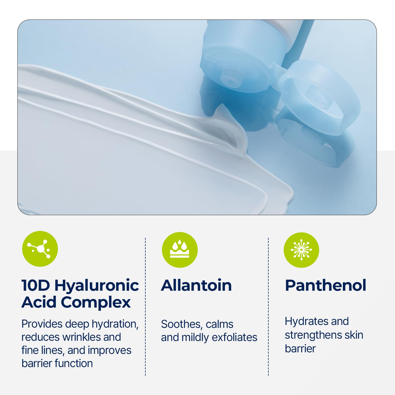 - Hyaluronic Acid Complex – Features 10 types of hyaluronic acid for multi-layered hydration.