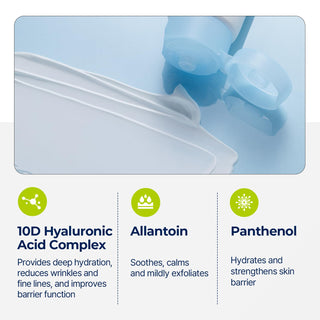 - Hydrates the skin with a blend of hyaluronic acids